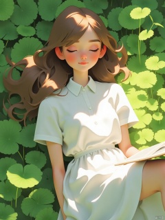 A serene scene unfolds: a single girl lies on lush green grass,Under the shade of the trees Leaf, Her long brown hair cascades down her back like a golden waterfall.  She wears a white collared shirt with short sleeves and a flowy white dress that drapes elegantly around her upper body..   while her eyes remain shut, lost in dreams. A book  beside her