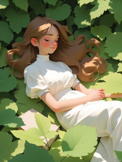 A serene scene unfolds: a single girl lies on lush green grass,Under the shade of the trees Leaf, Her long brown hair cascades down her back like a golden waterfall.  She wears a white collared shirt with short sleeves and a flowy white dress that drapes elegantly around her upper body..   while her eyes remain shut, lost in dreams. A book  beside her