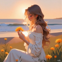 A serene portrait of a lone woman, her long hair flowing down the back, as she sits in a picturesque outdoor setting with the vast ocean stretching out before her. She wears a stunning white dress that drapes elegantly over her upper body, its sleeves extending past her elbows. Her closed eyes and subtle smile convey a sense of peacefulness. In her hand, she gently cradles a bright yellow flower as the warm sunset light casts a golden glow on the scene. The artist's signature watermark appears discreetly in the lower right corner. The sky above is painted with hues of pink and orange, meeting the horizon where the ocean's waves lap at the shore.