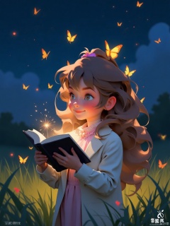 1girl, solo, long hair, blush, smile, brown hair, long sleeves, dress, standing, jacket, :d, outdoors, book, night, grass, bug, looking up, butterfly, fireworks, fireflies, sparkler, yellow butterfly,cartoon style,pixar style,guanghui,color trace,vector style