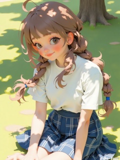 1girl, solo, long hair, looking at viewer, smile, bangs, skirt, brown hair, shirt, black hair, brown eyes, sitting, white shirt, braid, short sleeves, outdoors, artist name, twin braids, tree, lips, blue skirt, plaid, feet out of frame, shadow, watermark, plaid skirt, sunlight, red lips, shade, dappled sunlight
