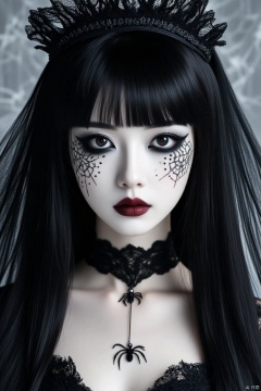 OBwans,Halloween makeup,Highly detailed face,OBbllai, This is a high-resolution photograph of a young woman with a strikingly detailed gothic makeup look. She has long, straight black hair with blunt bangs that frame her face. Her skin is pale, enhancing the dramatic contrast of her makeup. Her eyes are strikingly made up with a spider web pattern in black ink around the outer corners, extending down to her cheeks. The webs have small black dots mimicking spider legs, adding to the eerie effect. Her lips are painted a deep, matte red, and her eyebrows are meticulously shaped and filled in. She wears a black lace choker with intricate, vintage-inspired designs, adding to the gothic aesthetic. Her makeup is complemented by a delicate spider web veil draped around her head, giving a ghostly, ethereal feel. The background is a soft gray, with subtle white spider web patterns overlaying it, enhancing the spooky theme. The overall composition of the image is highly stylized, focusing on the intricate makeup and the eerie, haunting atmosphere. The lighting is soft, highlighting the details of her makeup without harsh shadows. The image evokes a sense of mystery and otherworldliness.