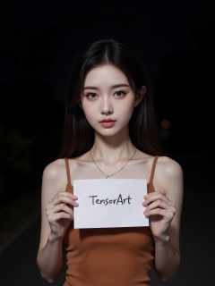 The photograph features a young East Asian woman standing against a dark, nighttime background. She has a slim, petite physique with delicate facial features, including large, almond-shaped eyes with subtle eyeliner, full lips painted in a soft pink hue, and a smooth, fair complexion. Her long, dark brown hair is parted in the middle and falls loosely over her shoulders. She wears a sleeveless, rust-orange **** top that accentuates her small breasts, and a thin, silver necklace with a small pendant. Her expression is neutral, with a slight hint of a smile, and she gazes directly at the camera.She holds a white piece of paper in front of her chest, with the handwritten text "TensorArt" in black, bold, cursive letters. The paper is slightly tilted and positioned centrally, covering her upper torso. The background is dark, with faint hints of blurred greenery and a dark road or path, suggesting an outdoor setting at night. The overall mood of the image is intimate and casual, with a focus on the subject's face and upper body, emphasizing her youthful appearance and the simplicity of her attire.