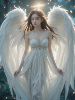 (((masterpiece))), (((best quality))), ((ultra-detailed)), (illustration), (detailed light),((an extremely delicate and beautiful)),(beautiful detailed eyes), (sunlight),(angel),solo,young girls,dynamic angle,floating, bare_shoulders,looking_at_viewer ,wings ,arms_up,halo,Floating white silk,(Holy Light),just like silver stars imploding we absorb the light of day