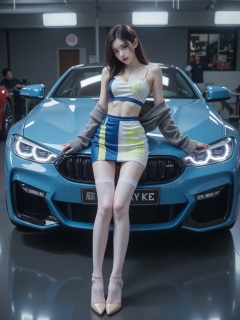 TENKAI Haute couture dress,thighhighs,long legs, 1girl,solo, white thighhighs,blue and white skirt,The number "BMW" is prominently displayed in green Fluorescent on the front of the crop top,garter straps,cropped jacket, This is a high-resolution portrait of a modern style,featuring a young woman. ,In this dynamic display scene,a model stands in front of a beautifully designed high-end sports car with a posture that is both elegant and powerful,perfectly complementing the vehicle she is showcasing. The sports car catches everyone's eye with its streamlined design and dazzling body colors,while the model adds life to the moment with her charm and confidence. The car model wears a simple and fashionable dress that shows her professional image without losing her feminine beauty. Her clothing echoes the colors and designs of the sports car,creating a harmonious yet engaging visual effect. Her hair,gently combed and falling over her shoulders,set off against her delicate makeup,showing her elegance and sophistication. Her eyes are firm and confident,as if telling the story behind the sports car and the speed and passion it represents. She leaned gently in front of the car,one hand touching the front,the other hand drooping. This pose not only shows her familiarity and closeness to the car,but also her professionalism and pursuit of perfect presentation., Featuring daily style, rich details, authentic skin details, ultra-high resolution, 32K UHD, best quality, masterpiece, exquisite details, delicate details, natural textures, soft lighting, sharpness, masterpiece, best quality (ray tracing), surrealism, photo realism, epic realism, this is a truly high-definition photo, stacked into composition, diagonal composition, complex details, epic, photo realism ,Soft light source, color correction, white balance,