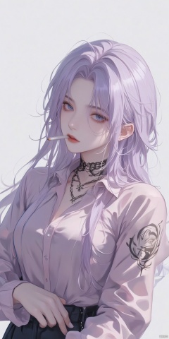 light purple hair and blue eyes. She has a cigarette in her mouth and is smoking. She is wearing a black choker around her neck. Her left arm is covered in a light pink shirt. Her right arm is adorned with a black tattoo. The background is white.