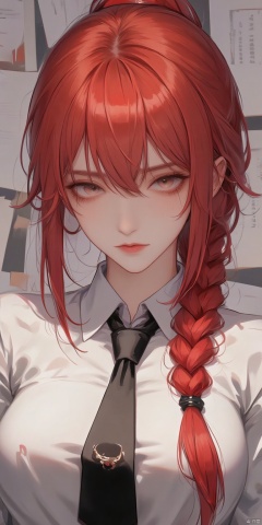 An animated image of an anime girl with long red hair. She is wearing a white long-sleeved button-down shirt with a white collar and a black tie. Her hair is styled in a braided ponytail. Her eyes are blue and her lips are pink. She has a serious expression on her face. Behind her