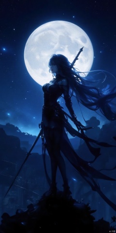 with her head turned to the left. The scene is set against a backdrop of a full moon