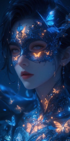 Close-up of a woman's face, focusing on her right side, wearing an ornate, intricate masquerade mask that covers her eyes and upper nose. The mask is detailed with lace-like patterns, embedded with small glowing lights and tiny luminescent butterflies, primarily in blue and orange hues. The mask has an elaborate design that merges seamlessly with her skin, which is illuminated with bioluminescent patterns glowing in shades of blue and orange, covering her neck, shoulders, and chest. Her lips are slightly parted, showing a natural yet,1girl