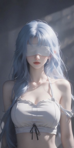 wearing a white strapless bra with a black bow at the bottom. Her eyes are covered by a white blindfold