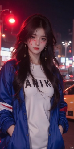 adding a pop of color to her outfit. The backdrop is a city street at night