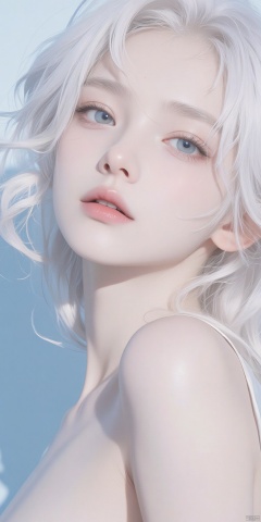a medium-angle shot of a woman's face is depicted in a close-up shot. The woman's eyes are a piercing blue and her long wavy blonde hair cascades over her shoulders. Her lips are a vibrant shade of pink adding a pop of color to the scene. The backdrop is a light blue creating a stark contrast to the woman's white skin. The shadow of the woman is cast on the left side of the image adding depth to the composition.