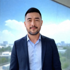1man,office,boss,High detail,high definition,high-definition skin texture,maximum resolution,masterpiece,mature male,a man with short black hair and a beard stood in front of the camera,The background is very blurry,and the sky is a soft blue with a few faint clouds,
