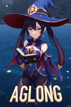 1girl, solo, long black hair with bangs, twintails, medium breasts, small breasts, wearing a witch hat, blue headwear, black gloves, detached sleeves, cape, leotard, bodystocking, thighlet, pantyhose, jewelry, earrings, smiling, looking at viewer, holding a book, standing in water with star symbols, cinematic lighting, dramatic atmosphere, high contrast, sharp focus, detailed background with a poster theme, dynamic composition, three-dimensional text AGlong in the middle below, movie poster style, inspired by Mona from Genshin Impact.
