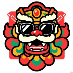 Badge design, Chinese elements, Chinese lion dance head glasses big black, firecrackers as decoration, lion dance around the elements of the snake, the year of the snake, pure white background