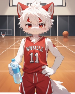 solo,male focus,(white hair,red eyes),indoors,basketball court,looking at viewer,red sleeveless,red shorts,sweat,one hand on hip,holding water bottle,hand on hip,depth of field.,body fur,furry,