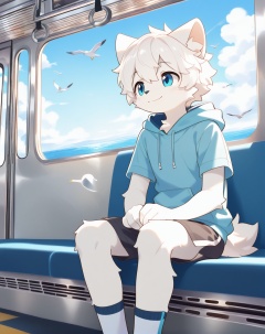 solo, smile, short hair, blue eyes, 1boy, animal ears, sitting, closed mouth, white hair, short sleeves, male focus, outdoors, sky, shorts, day, socks, artist name, cloud, hood, blue sky, hoodie, bird, ocean, ground vehicle, furry, white fur, train interior, seagull,source_furry,anthro