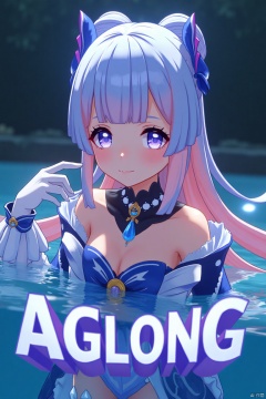 A solo girl with multicolored hair, blue and pink strands, long and flowing, with blunt bangs and a bow-shaped hair ornament. She has purple eyes, a blush, and a closed-mouth smile. Wearing a detached collar, frilled sleeves, wide and long, white half gloves, and thigh-highs, she is partially submerged in water. Her pose is dynamic, looking directly at the viewer. The setting is a cinematic movie poster with three-dimensional text AGlong in the middle below. The background is detailed, high contrast, and dramatic, with sharp focus and dynamic composition.