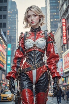 Cyberpunk style,Captured at eye-level on a vibrant day,a woman dressed in a red and white robot costume,adorned with black gloves and red boots. Her blonde hair is styled in a bob,adding a pop of color to the scene. The backdrop,blurred,reveals a cityscape of tall buildings,illuminated by a bright neon sign.,