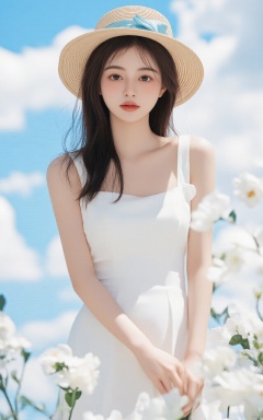 a young Asian woman stands in front of a backdrop of white flowers. She is dressed in a white strapless dress, adorned with ruffles on the shoulders and a straw hat adorned with a blue ribbon. Her hair is long and cascades over her shoulders, adding a touch of warmth to her face. The sky is a brilliant blue, dotted with fluffy white clouds.