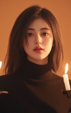 a young Asian woman with long dark hair, wearing a black turtleneck, is holding a lit candle in her left hand. The woman's face is turned slightly to the right, with a slight smile on her lips. Her eyes are a piercing blue, and her eyebrows are a darker shade of brown. Her hair is cascading down her shoulders, adding a touch of warmth to her face. The background is a stark brown, with two lit candles on the left side of the frame.