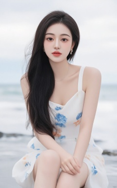 a beautiful Asian woman is seated on the beach, her long dark hair cascades over her shoulders. She is wearing a white strapless dress adorned with blue and orange flowers, and a silver necklace. Her earrings are dangling from her ears, adding a pop of color to her face. The backdrop, a serene sea, is blurred in the distance. The sky is a muted blue, with a few wispy clouds in the air.