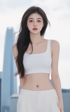 a young Asian woman stands in front of a backdrop of skyscrapers. She is dressed in a white bikini top and white shorts, her hair cascades over her shoulders. Her eyes are a piercing blue, her lips are pursed in a pink hue. Her hair is long and cascades in a ponytail, adding a touch of movement to her face. The sky is a muted blue, with a few wispy clouds in the distance.