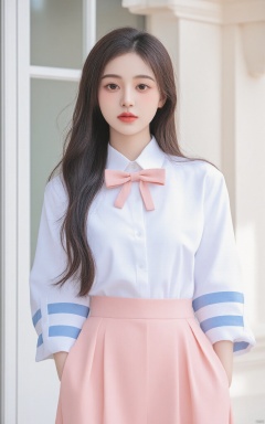 a young girl with long, light blue hair, wearing a pink bow tie, a white button-down shirt, and a pink skirt with blue stripes on the sleeves. Her hair is cascading over her shoulders, adding a pop of color to her outfit. She is standing in front of a backdrop of a building, with a white pillar and glass windows.