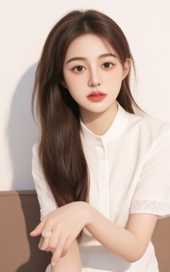 a medium-sized Asian woman with long, straight brown hair is seated on a brown couch. She is wearing a white sleeveless blouse with a white lace trim. Her lips are a light pink color, adding a touch of pink to her lips. Her eyes are a piercing blue, and her eyebrows are a darker shade of brown. The backdrop is a plain white wall, and a shadow is visible on the left side of the image.