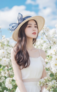 a young Asian woman stands in front of a backdrop of white flowers. She is dressed in a white strapless dress, adorned with ruffles on the shoulders and a straw hat adorned with a blue ribbon. Her hair is long and cascades over her shoulders, adding a touch of warmth to her face. The sky is a brilliant blue, dotted with fluffy white clouds.