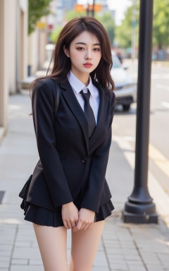 a young Asian woman stands on a city sidewalk, her long brown hair cascades over her shoulders. She is dressed in a black blazer, a white collared shirt, a black tie, and a black skirt. Her skirt is short and pleated, and she is holding a black purse in her left hand. The woman's left hand is resting on her hip, and her right hand is draped over her left shoulder. A black pole is to the right of the woman, adding a touch of contrast to the scene. A car can be seen parked on the street in the background.