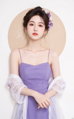 a young Asian woman stands in front of a white backdrop. She is dressed in a purple strapless dress adorned with white flowers. Her hair is styled in a wreath of purple flowers, adding a touch of beauty to the scene. Her dress is adorned with a sheer sheer white robe draped across her body. Her hands are clasped in her lap. Her eyes are a piercing blue, her lips are a darker shade of blue. Her eyebrows are a light brown, and her hair is a darker brown. The backdrop is a stark white, with a brown circle in the center.