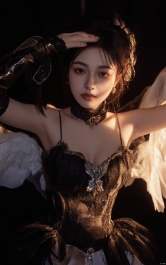 a woman dressed in a black and gold armor, adorned with wings on her shoulders and arms. Her eyes are a piercing blue, her hair is a dark brown, her eyes a piercing yellow, and her arms are raised in the air. The background is a deep black, creating a stark contrast to the woman's armor.