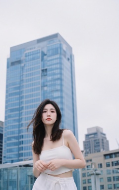 a young Asian woman stands in front of a backdrop of skyscrapers. She is dressed in a white bikini top and white shorts, her hair cascades over her shoulders. Her eyes are a piercing blue, her lips are pursed in a pink hue. Her hair is long and cascades in a ponytail, adding a touch of movement to her face. The sky is a muted blue, with a few wispy clouds in the distance.