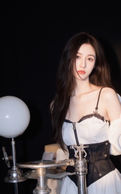 a woman with long, straight black hair stands in front of a dark backdrop. She is facing the left side of the frame, her face is angled slightly to the right. Her hair cascades over her shoulders, framing her face. She's dressed in a black and white corset, with a white hoodie draped over her neck. The corset has a unique design on the front, adding a touch of contrast to her outfit. To the left of her, a white globe-like object casts a shadow on the right of her.