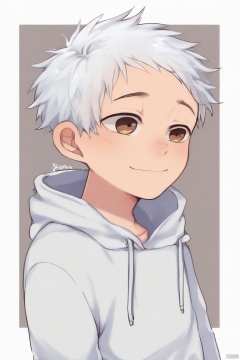 adltmn-yuma-style,1boy,white hair,white jacket,border,child,drawstring,hood,hood down,hooded jacket,jacket,male focus,outside border,short hair,smile,solo,upper body,white border (masterpiece,best quality),