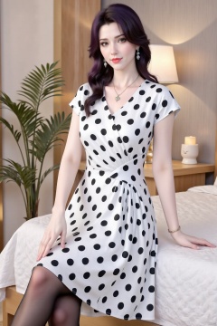 (masterpiece, best quality:1.4),finely detailed,1girl, solo, long hair, looking at viewer,jewelry,  purple hair, necklace, lips, realistic,(white polka dot dress:1.2),short sleeves,bedroom,plants,sitting on the bed,black pantyhose,earrings,XuanYi