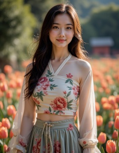 HDR photo, High dynamic range, realistic, A woman with long hair and brown eyes, wearing a chinese skirt, full body, outdoors, flowers,