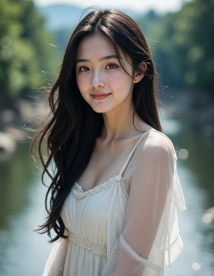 film grain, 1girl, solo, realistic, black hair, looking at viewer, dress, long hair, smile, white dress, brown eyes, photorealistic, upper body, river,