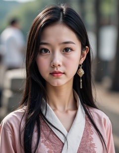 1girl, solo, young, teenage, earrings, jewelry, realistic, looking at viewer, long hair, black hair, upper body, closed mouth, chinese clothes, outdoors,