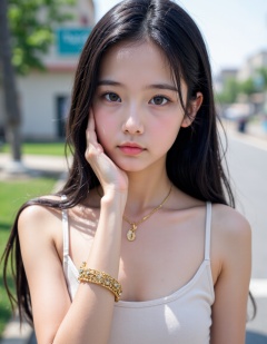 1girl, solo, young, jewelry, realistic, looking at viewer, long hair, black hair, upper body, closed mouth, outdoors,