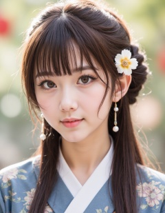 1girl, solo, earrings, jewelry, realistic, looking at viewer, long hair, brown hair, hair ornament, flower, hair flower, hair bun, upper body, closed mouth, chinese clothes, outdoors,