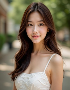 HDR photo, High dynamic range, vivid, rich details, clear shadows and highlights, realistic, intense, enhanced contrast, highly detailed, outdoors, 1girl, solo, realistic, brown hair, looking at viewer, dress, long hair, smile, white dress, brown eyes, photorealistic, blurry background, upper body, lips, blurry, sleeveless, breasts
