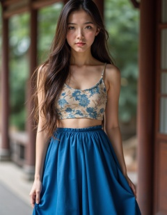 HDR photo, High dynamic range, realistic, teenage, A woman with long hair and brown eyes, wearing a blue chinese skirt, full body,