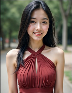 film grain, photorealistic, realistic, 1girl, solo, black hair, looking at viewer, dress, long hair, smile, halter neck pleated dress, sleeveless, breasts, brown eyes, lips, upper body, outdoors,