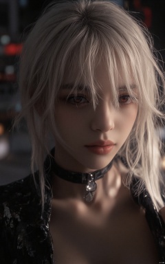 white hair,red eyes,cityscape,cute 1girl,lip biting,seductive leaning forward,detailed face,realistic,photorealistic,(studio light:1.2),evil smile,choker,Deep photo,depth of field,shadows,messy hair,seductive silhouette play,dark,nighttime,dark photo,grainy,dimly lit,shot on RED camera,harsh camera flash ((eyes closed)),bangs,hime cut,fashion model,full body, hubg_beauty_girl