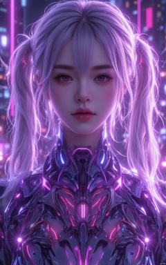 masterpiece, best quality, illustration, beautiful detailed eyes,colorful background,mechanical prosthesis,mecha coverage,emerging dark purple across with white hair,pig tails,disheveled hair,fluorescent purple,cool movement,rose red eyes,beatiful detailed cyberpunk city,multicolored hair,beautiful detailed glow,1 girl, expressionless,cold expression,insanity, long bangs,long hair, lace,dynamic composition, motion, ultra - detailed, incredibly detailed, a lot of details, amazing fine details and brush strokes, smooth, hd semirealistic anime cg concept art digital painting