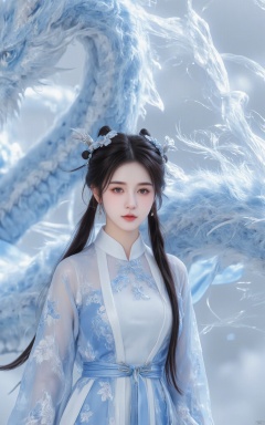 High quality,masterpiece,rich details,Blue oriental dragon,white dragon hair,real fur,xiaoyan,1girl,solo,long hair,breasts,looking at viewer,blue eyes,black hair,hair ornament,long sleeves,dress,cleavage,jewelry,medium breasts,tail,flower,earrings,horns,hair bun,blue dress,chinese clothes,single hair bun