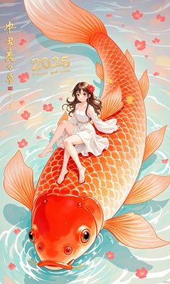 qfjl,Chinese style illustration,An animated image of a girl with long brown hair, wearing a white dress and a red flower in her hair. The girl is sitting on top of a large orange fish that is floating on a body of water. The fish has a long orange tail that extends from the top of the fish to the bottom of the image. There are pink flowers floating in the water around the fish.A golden font reads' Happy New Year 2025 ',