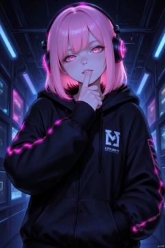 1girl, solo, looking at viewer, bangs, long sleeves, closed mouth, upper body, pink hair, virtual youtuber, hood, medium hair, pink eyes, hoodie, glowing, headphones, hood down, hand in pocket, black hoodie, neon lights